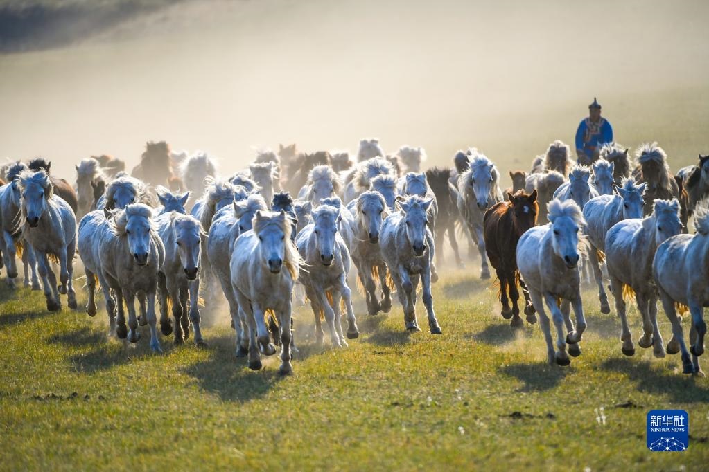 初夏時節(jié),內蒙古錫林郭勒盟西烏珠穆沁旗的草原開始返青。當地牧民趕著馬匹,來到草原上馴馬,景象壯觀。