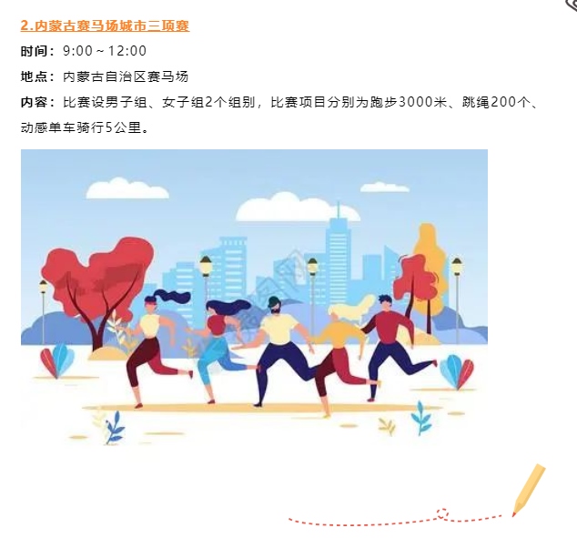 本次運(yùn)動(dòng)會(huì)認(rèn)真踐行“以人民為中心”辦賽理念,創(chuàng)新探索聚集少、規(guī)模小、符合大眾運(yùn)動(dòng)口味的內(nèi)蒙古賽馬場(chǎng)城市三項(xiàng)賽,包含跑步3000米、跳繩200個(gè)和動(dòng)感單車騎行5公里3個(gè)項(xiàng)目比賽。此外,還將舉辦公園系列挑戰(zhàn)賽、“跑遍青城”系列路跑活動(dòng)等,讓群眾在暢享運(yùn)動(dòng)的過(guò)程中盡情領(lǐng)略城市綠景的清新曼妙,進(jìn)一步推動(dòng)全民健身與全民健康深度融合。