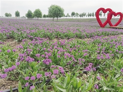 8月23日,記者來(lái)到馬鞭草花海,遠(yuǎn)遠(yuǎn)望去,遍野的紫色在視線中彌漫開(kāi)來(lái),叫人情不自禁奔向花海。微風(fēng)拂過(guò),花枝搖曳,心形造型、大風(fēng)車(chē)、馬頭琴等景觀小品點(diǎn)綴其間,給花海增添了一份浪漫情調(diào)。人們沿著