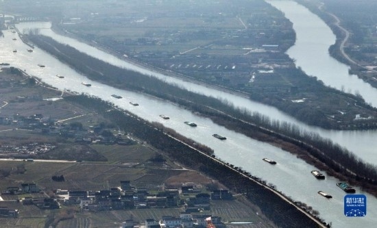 2月15日,貨船行駛在京杭大運河江蘇揚州段(無人機照片)。