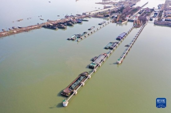 2月14日,貨船有序通過位于江蘇宿遷的京杭大運河皂河船閘(無人機照片)。