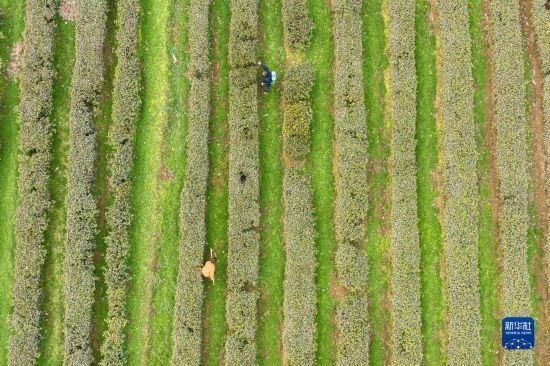 2月17日,茶農在湖北省丹江口市土關埡村武當茶谷勞作(無人機照片)。