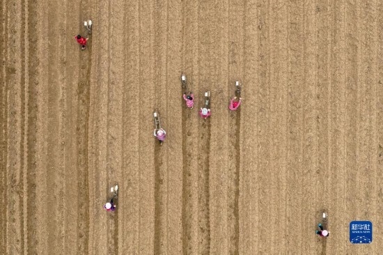2月16日,村民在湖北省武漢市經開區(qū)鄧南街田間進行播種作業(yè)(無人機照片)。