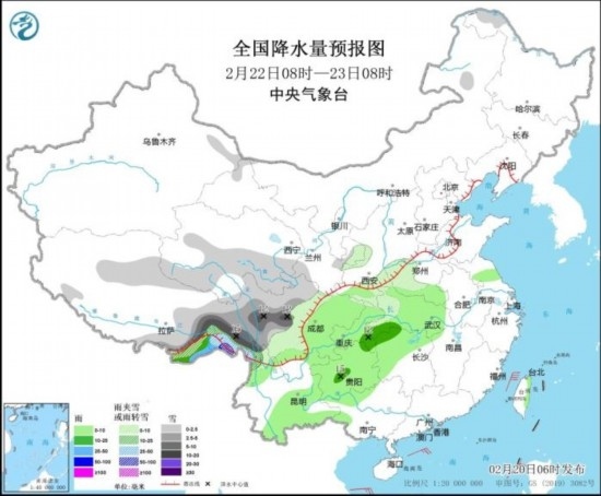 2月22日08時至23日08時,西藏東部、云南西北部、青海南部、川西高原、甘肅東部、陜西東南部、河南西部等地部分地區(qū)有小到中雪或雨夾雪,其中,西藏東部、川西高原、云南西北部等地局地有大到暴雪(10~15毫米)。西南地區(qū)大部、江漢大部、湖南西部和北部等地部分地區(qū)有小到中雨,其中,西藏東南部局地有大到暴雨。臺灣海峽、巴士海峽、南海東部等地部分地區(qū)有6~7級風,陣風8級。
