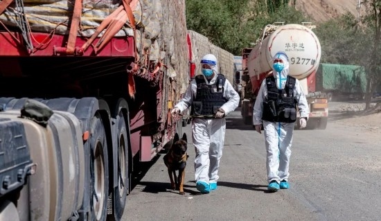 圖為疫情期間,庫(kù)地邊境檢查站移民管理警察攜警犬開展車輛查緝工作。