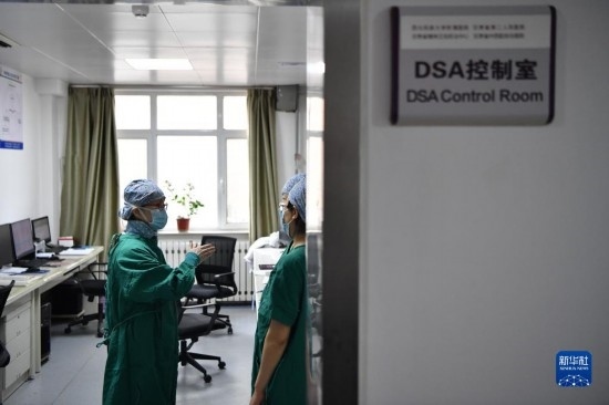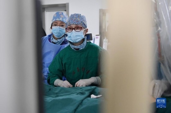 3月7日,馬娜(右)和同事在手術(shù)室為患者進(jìn)行介入手術(shù)治療。