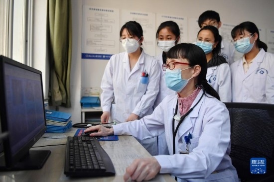 3月7日,馬娜(左一)和同事交流患者病情。