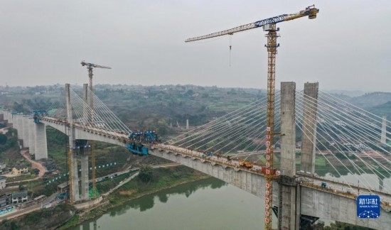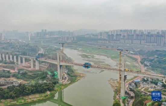 3月18日在位于四川省瀘州市拍攝的渝昆高鐵瀘州沱江特大橋主跨合龍施工現(xiàn)場(無人機照片)。