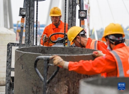 3月18日,在位于四川省瀘州市的渝昆高鐵瀘州沱江特大橋主跨合龍施工現(xiàn)場,施工人員在安裝混凝土運輸管道。