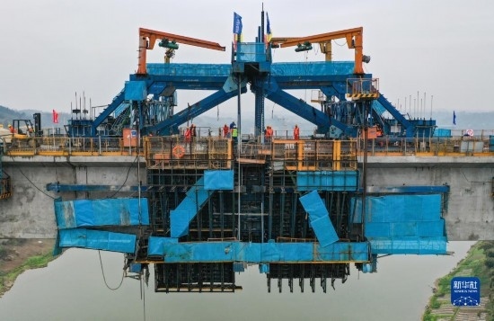 3月18日在四川省瀘州市拍攝的渝昆高鐵瀘州沱江特大橋主跨合龍施工現(xiàn)場(無人機照片)。