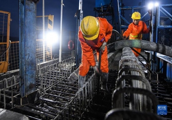 3月18日,在位于四川省瀘州市的渝昆高鐵瀘州沱江特大橋主跨合龍現(xiàn)場,施工人員在進行混凝土澆筑。