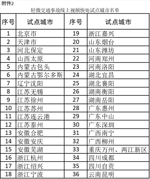 2、輕微交通事故線上視頻快處試點(diǎn)城市名單