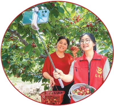2022年6月8日,江蘇省海安市大公鎮(zhèn)姜橋村一櫻桃種植園內(nèi),青年黨員志愿者與農(nóng)場(chǎng)主一起直播推銷剛剛采摘的櫻桃。 翟慧勇攝(人民視覺(jué))