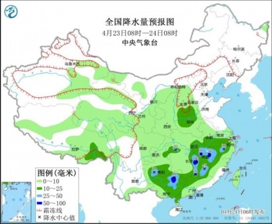 全國(guó)降水量預(yù)報(bào)圖(4月23日08時(shí)-24日08時(shí))