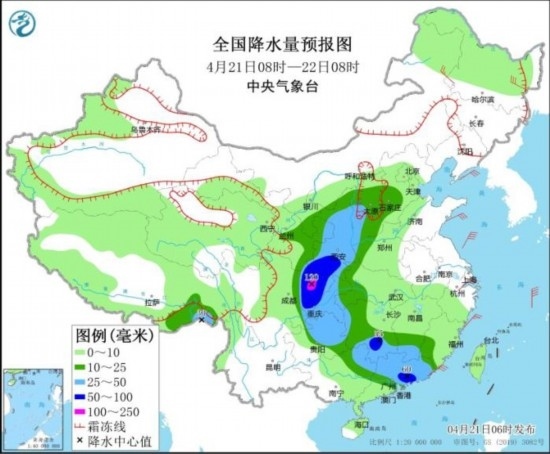 4月21日08時(shí)至22日08時(shí),新疆沿天山高海拔地區(qū)和南疆南部、西藏北部和東部、青海東部、甘肅中南部、寧夏、陜西北部、山西中北部等地部分地區(qū)有小到中雪或雨夾雪,其中甘肅南部、山西西部局地有大到暴雪(10~18毫米);西北地區(qū)東南部、華北中南部、西南地區(qū)東部、江漢西部、江南中南部、華南北部和東部等地部分地區(qū)有中到大雨,其中,四川盆地東部、重慶西部、湖南南部、廣東東部等地部分地區(qū)有暴雨或大暴雨(100~120毫米)。內(nèi)蒙古東北部、黑龍江東北部、浙江北部等地部分地區(qū)有4~6級(jí)風(fēng)。渤海海域、黃海海域、東海北部、臺(tái)灣海峽將有6~7級(jí)風(fēng),陣風(fēng)8~9級(jí)。
