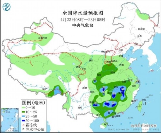 全國(guó)降水量預(yù)報(bào)圖(4月22日08時(shí)-23日08時(shí))