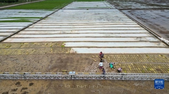 4月20日,在彭山區(qū)公義鎮(zhèn)的數(shù)智水稻示范基地,工人在秧盤(pán)智能傳輸帶上轉(zhuǎn)運(yùn)育秧盤(pán)。