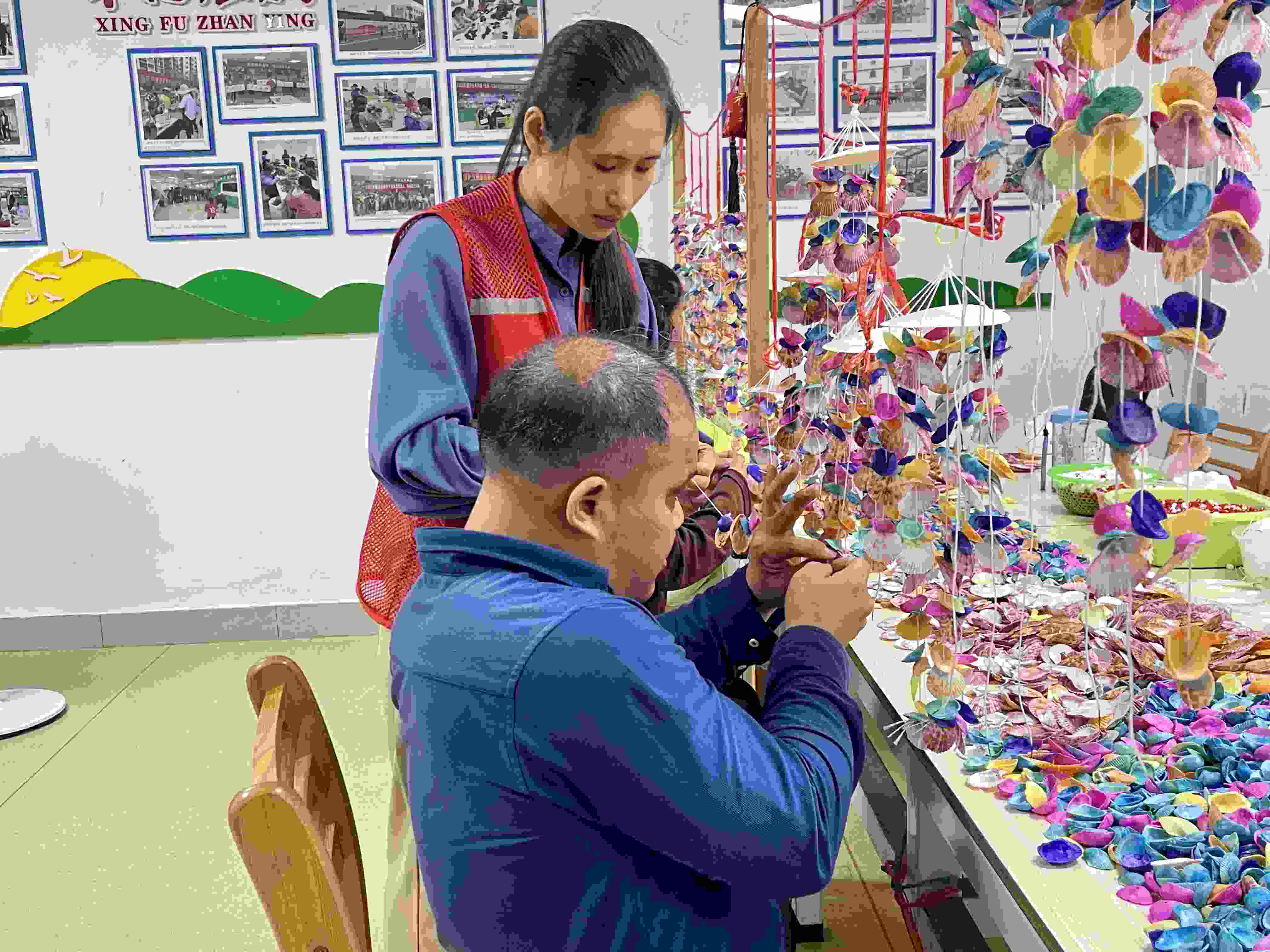 在北海市銀海區(qū)僑港殘疾人輔助性就業(yè)及日間照料中心(以下簡(jiǎn)稱“中心”),工作人員在指導(dǎo)殘疾人串貝殼。這里已經(jīng)安置了11名殘疾人與企業(yè)簽訂勞動(dòng)合同,人均年收入在2萬元左右。