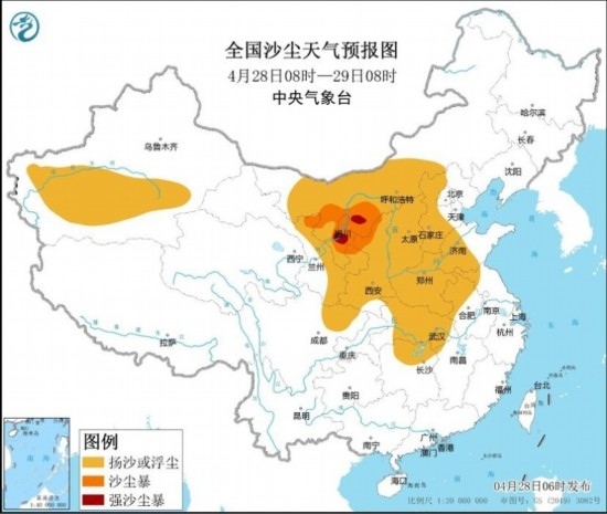 受冷空氣大風(fēng)影響,預(yù)計4月28日08時至29日08時,新疆南部、內(nèi)蒙古中西部、甘肅北部和東部、寧夏、陜西、四川盆地北部、山西、河北西部、河南、山東中西部、湖北、湖南北部、安徽北部、江蘇西北部等地的部分地區(qū)有揚(yáng)沙或浮塵天氣,其中,內(nèi)蒙古西南部、甘肅東北部、寧夏中北部、陜西西北部等地的部分地區(qū)有沙塵暴,局地有強(qiáng)沙塵暴。中央氣象臺4月28日06時發(fā)布沙塵暴藍(lán)色預(yù)警。