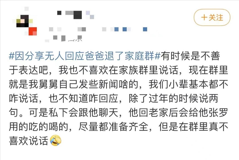 日前,一則“因分享無(wú)人回應(yīng)爸爸退了家庭群”的話題引發(fā)公眾關(guān)注,登上熱搜。