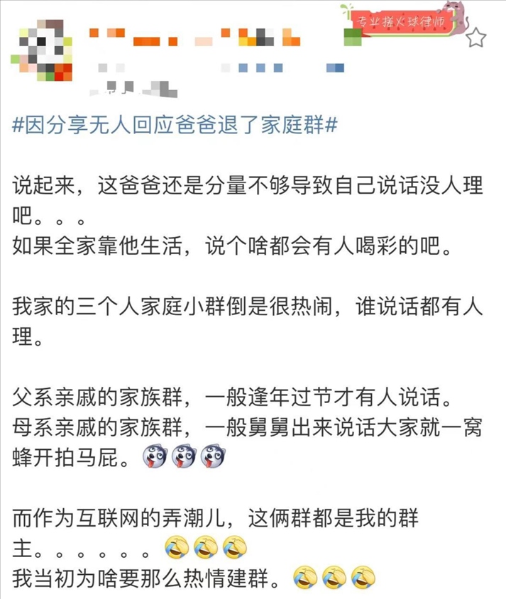 “雖然如今有很多家庭群,但群體內(nèi)部卻顯得十分冷清。這種現(xiàn)象映射出,隨著現(xiàn)代社會(huì)的快速發(fā)展和互聯(lián)網(wǎng)時(shí)代信息量的爆炸,大家的認(rèn)知水平多元化和分層化程度極高。因此,即便在自己的家庭圈中,不少人仍然感覺(jué)‘聊不到一塊去’。”四川明炬律師事務(wù)所資深家事律師張承鳳分析。