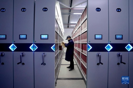 4月28日,在上海市檔案館的庫(kù)房?jī)?nèi),保管部工作人員杜新慶在智能密集架間提取檔案。