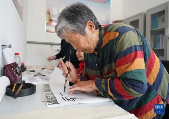 5月9日,老人在北京市平谷區(qū)西樊各莊村“養(yǎng)老驛站”練習書法。