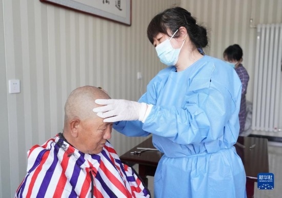 5月9日,在北京市平谷區(qū)西樊各莊村“養(yǎng)老驛站”,工作人員為老人理發(fā)。