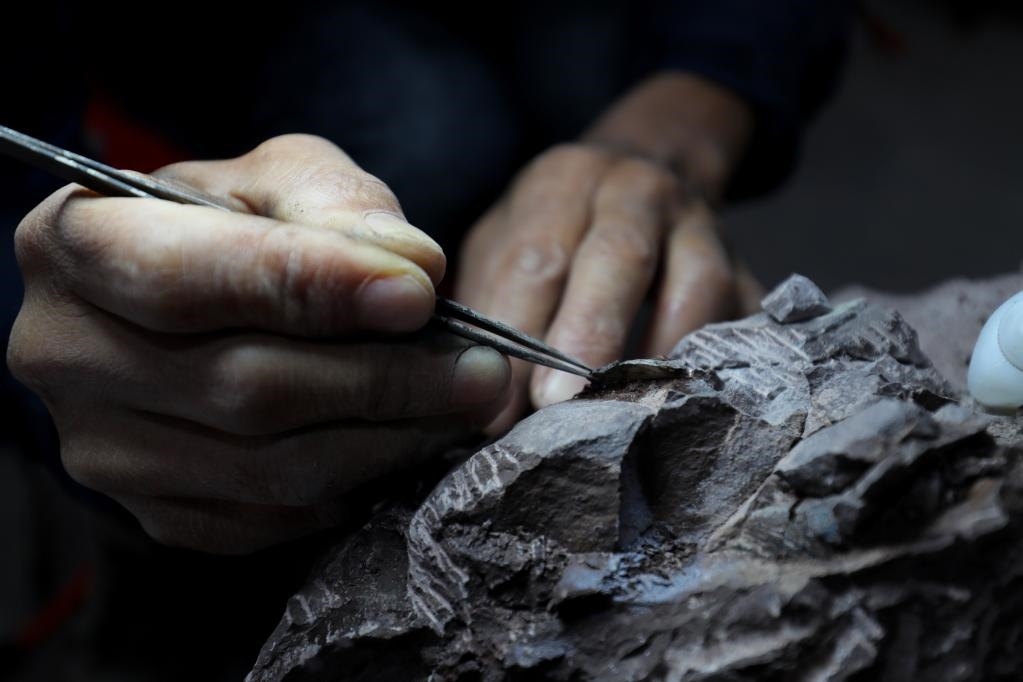 圖為工作人員正在研究恐龍蛋化石。(受訪者供圖)
