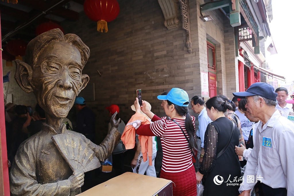天津古文化街位于海河西岸,是國家5A級旅游景區(qū)、津門十景之一。5月16日,游客從相聲大師馬三立的雕塑旁走過。人民網 崔新耀攝