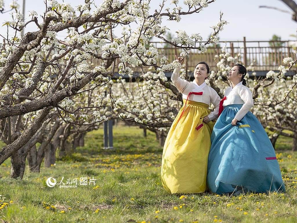 5月11日,吉林省延邊州龍井市萬畝梨園迎來梨花盛開期。走在梨樹下,游客們載歌載舞,彈琴賞花,拍照留念。人民網 李洋攝