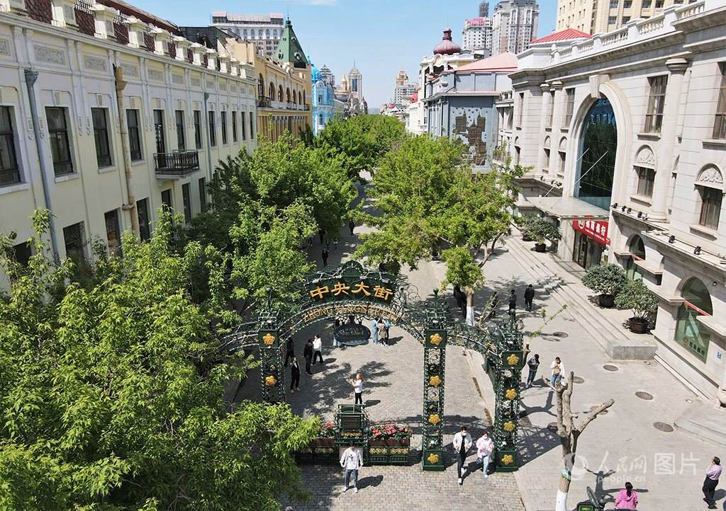 5月17日,游人漫步在哈爾濱市中央大街,感受百年老街的歐陸風情,盡賞冰城的夏日風光。人民網 蘇靖剛攝