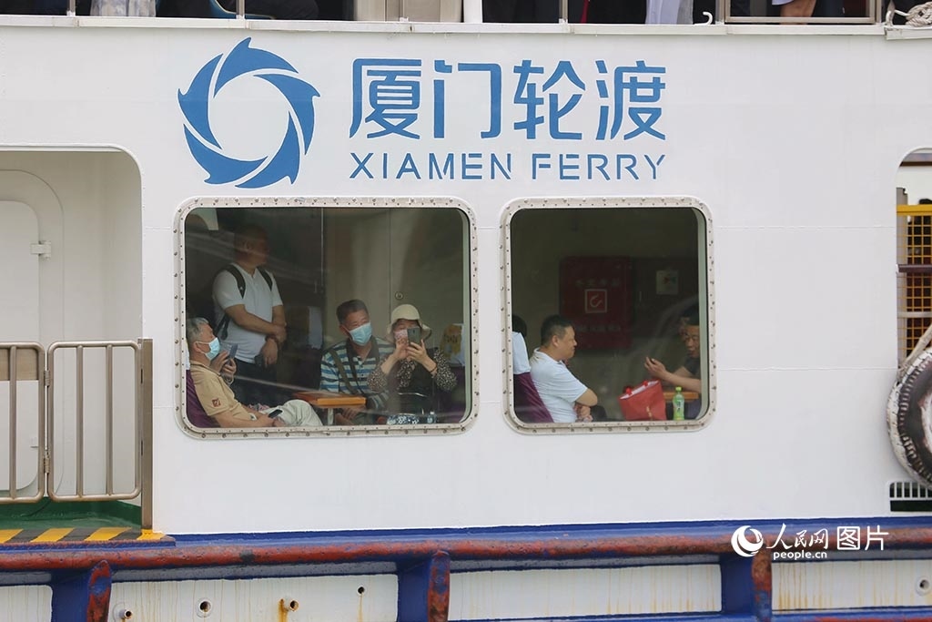 5月14日,廈門輪渡船??抗睦藥Z內厝澳碼頭,船艙里的游客迫不及待地拿起手機拍照。人民網記者 陳博攝