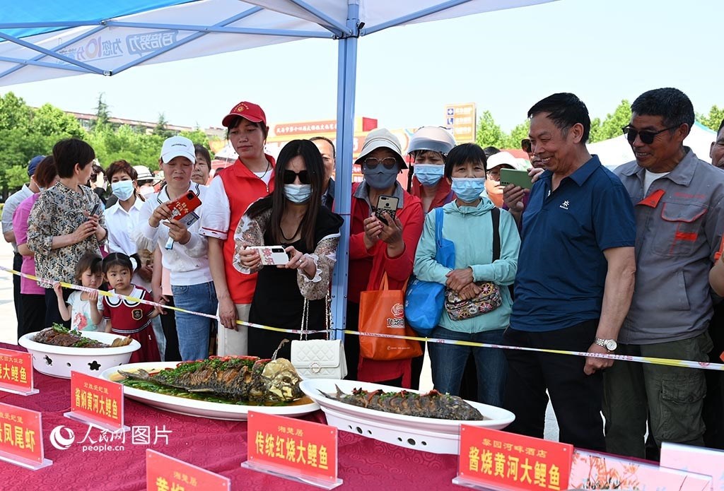 5月17日,“中國旅游日”主題周活動期間,河南省義馬市舉辦“櫻紅五月”美食節(jié),集中展示當地的特色美食、名優(yōu)特產,為了讓游客有更好的體驗,當地12家飯店還進行了精彩紛呈的廚藝大比拼?;顒蝇F場,游客在圍觀經典豫菜“紅燒黃河大鯉魚”。人民網記者 王玉興攝