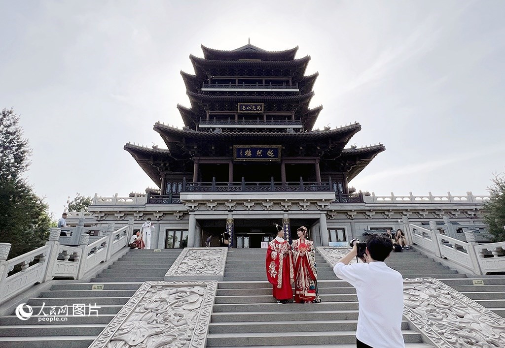 今年以來,濟南大明湖畔的“江北第一樓”超然樓因其獨特的人文氣息和景觀氣質火爆網絡,成為爆火“出圈”的網紅打卡地。5月16日,在大明湖超然樓前,身穿古代服飾打卡拍照的游客絡繹不絕,在山色與湖光之間盡展古韻美感。人民網記者 劉祺攝
