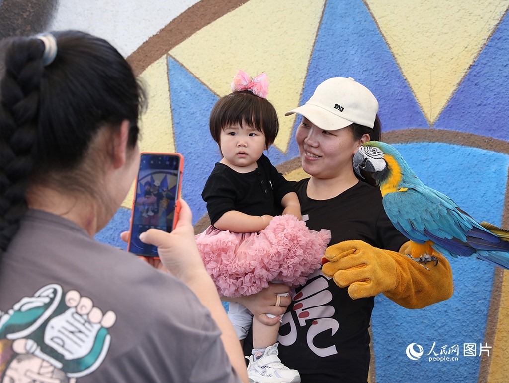 5月18日,雄安郊野公園辛瑪森林動物樂園內,家長帶著孩子正與表演動物互動。人民網 李兆民攝