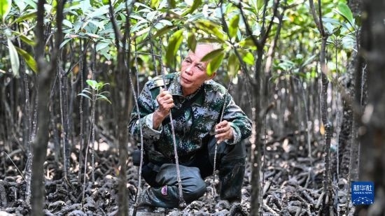 莫積瑞老人在紅樹林間采集木欖花粉(5月20日攝)。