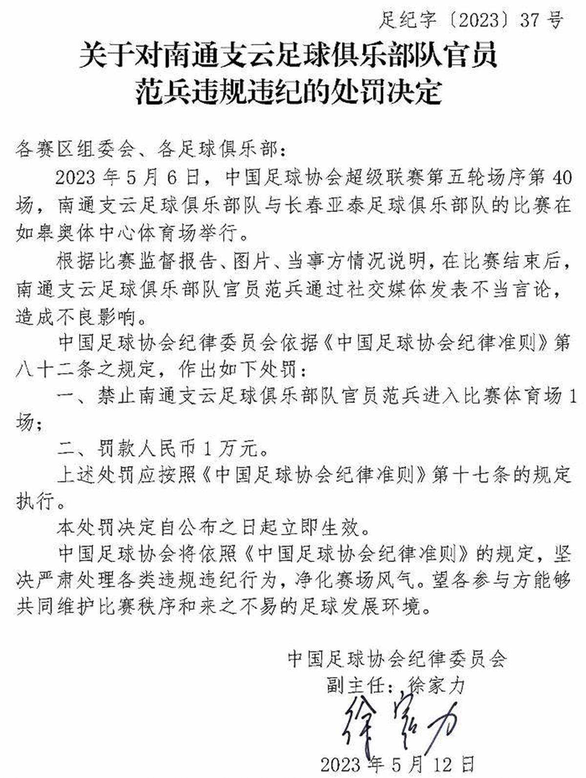 在收到罰單后,反應(yīng)最為激烈的當(dāng)屬中超南通支云足球俱樂部,該俱樂部隨后發(fā)布了一紙官方公告,公開質(zhì)疑這份罰單,并表示,在必要時將向FIFA進(jìn)行投訴、反映事實情況,并會堅定地選擇以法律為武器捍衛(wèi)俱樂部的合法權(quán)益。