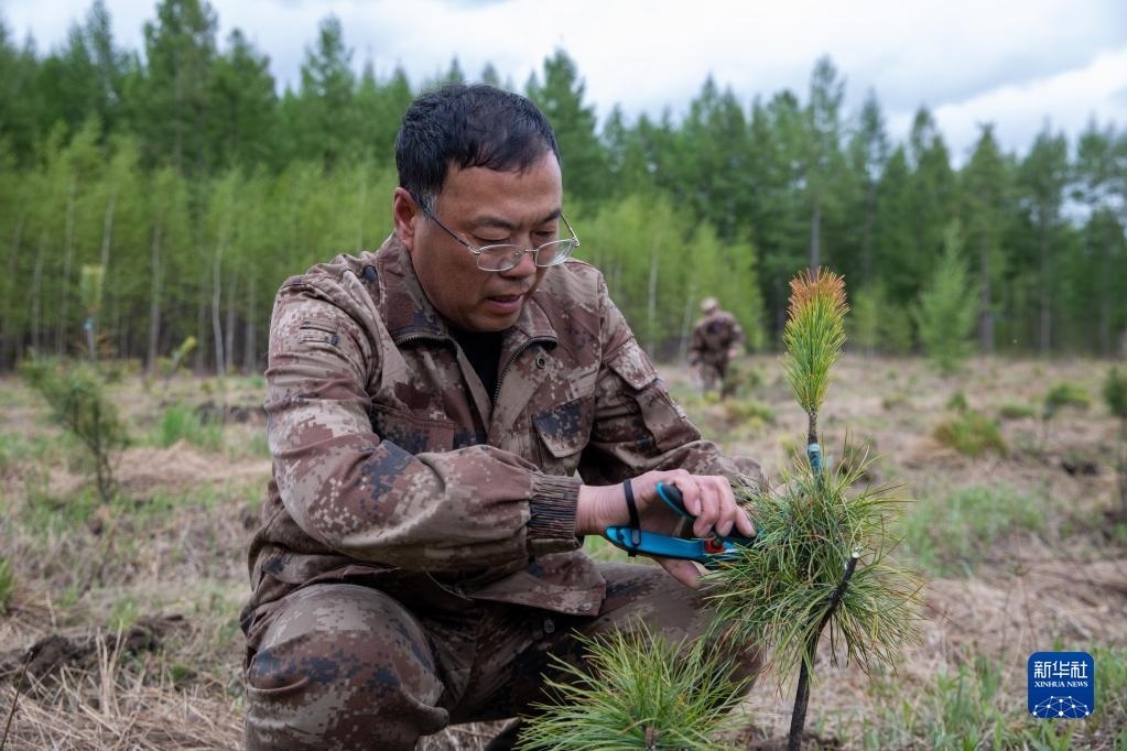 5月21日,在伊春森工集團(tuán)紅星林業(yè)局公司五星河林場(chǎng)分公司紅松兼果林基地,工作人員在養(yǎng)護(hù)紅松嫁接苗。