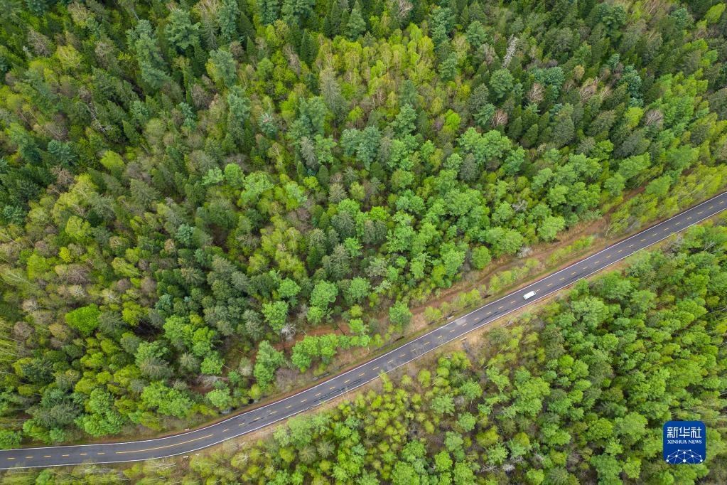 5月21日,園區(qū)車輛在五營(yíng)國(guó)家森林公園內(nèi)穿行(無(wú)人機(jī)照片)。