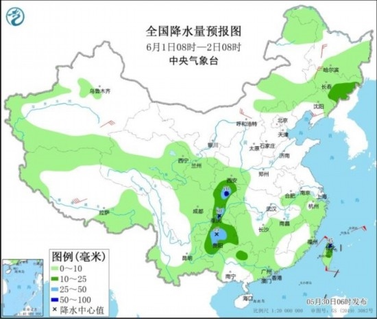 5月30日08時至31日08時,內(nèi)蒙古中部、青海東部、甘肅南部、四川東北部、重慶等地部分地區(qū)有中到大雨,其中,臺灣島東部等地部分地區(qū)有暴雨(50~80毫米)。新疆沿天山地區(qū)和南疆盆地、內(nèi)蒙古大部、河北北部等地部分地區(qū)有4~6級風。巴士海峽將有8~10級、陣風11級的偏北風轉西北風,臺灣以東洋面將有8~9級、陣風10級的東北風轉偏北風。