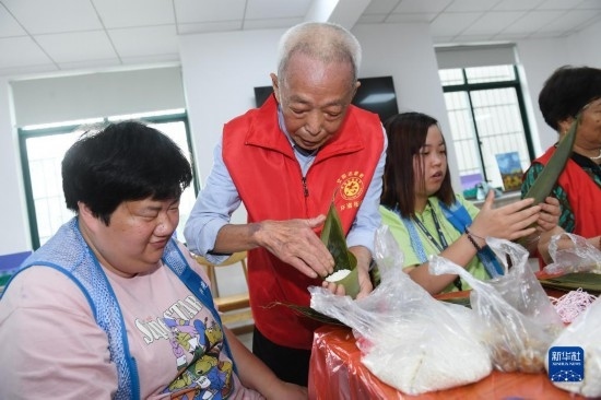 5月29日,在湖州市環(huán)渚街道玉堂橋社區(qū)組織的迎端午活動中,凌法林(左二)和其他志愿者一起指導(dǎo)殘障人士包粽子。