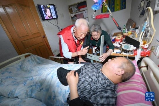 5月29日,在湖州市環(huán)渚街道玉堂橋社區(qū),凌法林(左)上門走訪一位癱瘓在床的殘障人士,為他做基本醫(yī)療檢查。