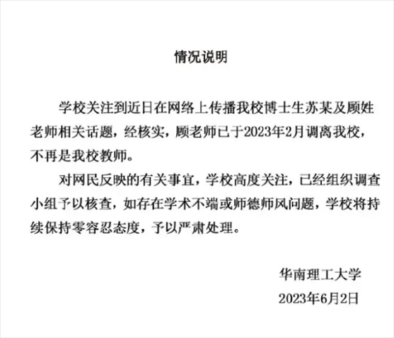 網(wǎng)傳女博士介入導師婚姻,導師帶其發(fā)高水平論文,華南理工大學、四川大學啟動調(diào)查工作。