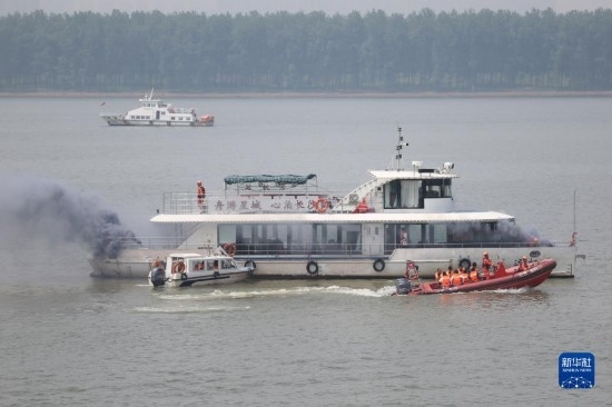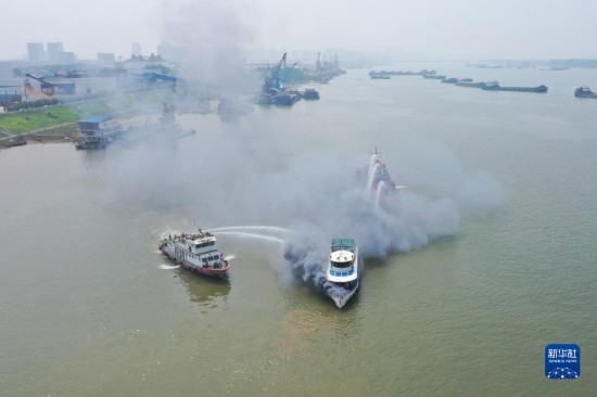 6月2日,在水域救援實(shí)戰(zhàn)演習(xí)現(xiàn)場(chǎng),消防救援人員駕駛消防艇在模擬水上滅火行動(dòng)(無(wú)人機(jī)照片)。