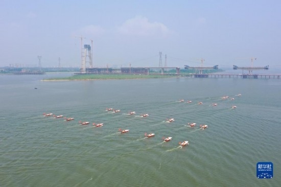 這是6月2日在水域救援實(shí)戰(zhàn)演習(xí)現(xiàn)場(chǎng)拍攝的消防舟艇編隊(duì)(無(wú)人機(jī)照片)。