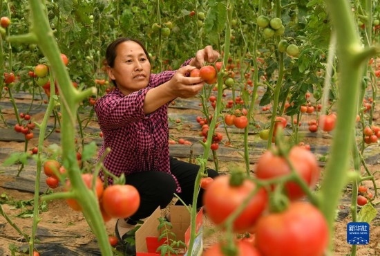 6月4日,農(nóng)民在獻(xiàn)縣河城街鎮(zhèn)梅莊洼農(nóng)場(chǎng)大棚內(nèi)采摘西紅柿。