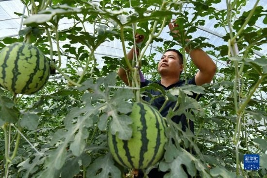 6月4日,農(nóng)民在獻(xiàn)縣河城街鎮(zhèn)梅莊洼農(nóng)場(chǎng)大棚內(nèi)管理種植的西瓜。