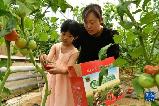 6月4日,游客在獻(xiàn)縣河城街鎮(zhèn)梅莊洼農(nóng)場(chǎng)大棚內(nèi)采摘西紅柿。