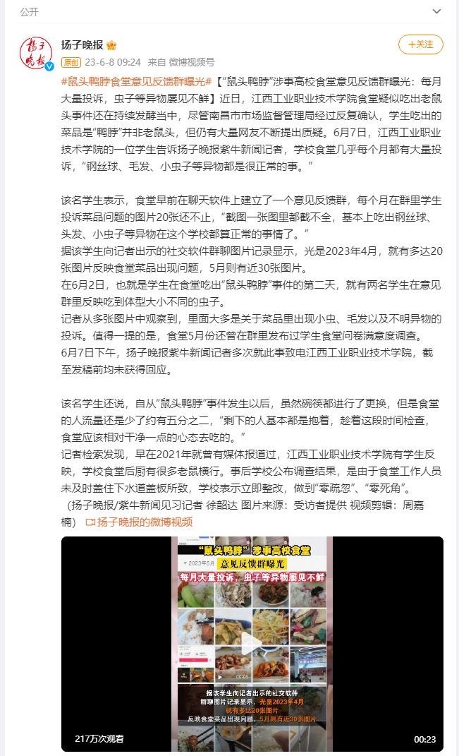 ·“鼠頭鴨脖”涉事高校食堂意見(jiàn)反饋群曝光:每月大量投訴,鋼絲球、毛發(fā)、蟲子等異物屢見(jiàn)不鮮。